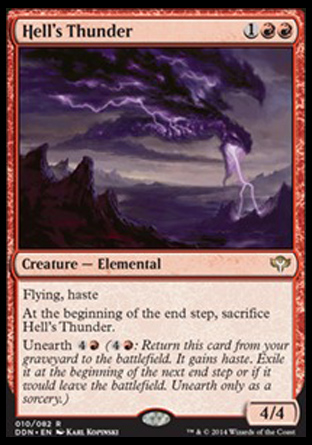 Flying, haste At the beginning of the end step, sacrifice Hell's Thunder. Unearth (: Return this card from your graveyard to the battlefield. It gains haste. Exile it at the beginning of the next end step or if it would leave the battlefield. Unearth only as a sorcery.)