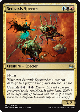 Flying Whenever Sedraxis Specter deals combat damage to a player, that player discards a card. Unearth (: Return this card from your graveyard to the battlefield. It gains haste. Exile it at the beginning of the next end step or if it would leave the battlefield. Unearth only as a sorcery.)