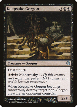 Deathtouch : Monstrosity 1. (If this creature isn't monstrous, put a +1/+1 counter on it and it becomes monstrous.) When Keepsake Gorgon becomes monstrous, destroy target non-Gorgon creature an opponent controls.