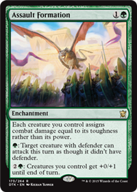 Each creature you control assigns combat damage equal to its toughness rather than its power. : Target creature with defender can attack this turn as though it didn't have defender. : Creatures you control get +0/+1 until end of turn.
