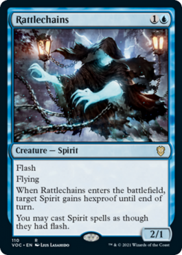 Flash Flying When Rattlechains enters the battlefield, target Spirit gains hexproof until end of turn. You may cast Spirit spells as though they had flash.