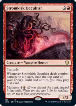 Trample Whenever Stromkirk Occultist deals combat damage to a player, exile the top card of your library. Until end of turn, you may play that card. Madness (If you discard this card, discard it into exile. When you do, cast it for its madness cost or put it into your graveyard.)