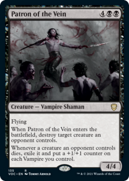 Flying When Patron of the Vein enters the battlefield, destroy target creature an opponent controls. Whenever a creature an opponent controls dies, exile it and put a +1/+1 counter on each Vampire you control.