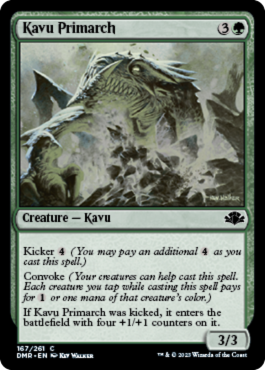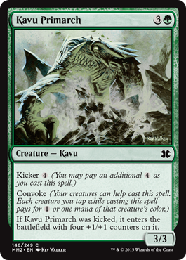 Kicker (You may pay an additional as you cast this spell.) Convoke (Your creatures can help cast this spell. Each creature you tap while casting this spell pays for or one mana of that creature's color.) If Kavu Primarch was kicked, it enters the battlefield with four +1/+1 counters on it.
