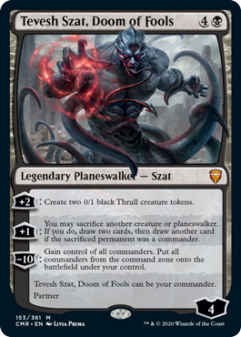 +2: Create two 0/1 black Thrull creature tokens. +1: You may sacrifice another creature or planeswalker. If you do, draw two cards, then draw another card if the sacrificed permanent was a commander. −10: Gain control of all commanders. Put all commanders from the command zone onto the battlefield under your control. Tevesh Szat, Doom of Fools can be your commander. Partner