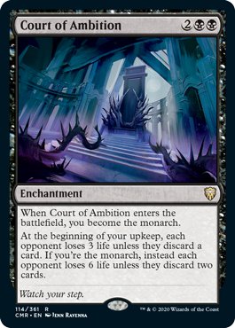 When Court of Ambition enters the battlefield, you become the monarch. At the beginning of your upkeep, each opponent loses 3 life unless they discard a card. If you're the monarch, instead each opponent loses 6 life unless they discard two cards.