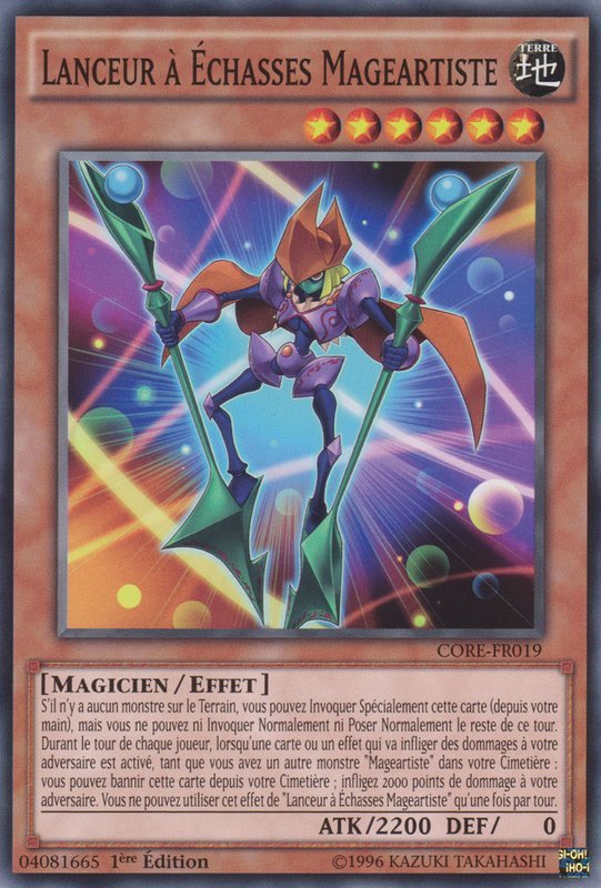 S'il n'y a aucun monstre sur le Terrain, vous pouvez Invoquer Spécialement cette carte (depuis votre main), mais vous ne pouvez ni Invoquer Normalement ni Poser Normalement le reste de ce tour. Durant le tour de chaque joueur, lorsqu'une carte ou un effet qui va infliger des dommages à votre adversaire est activé, tant que vous avez un autre monstre "Mageartiste" dans votre Cimetière : vous pouvez bannir cette carte depuis votre Cimetière ; infligez 2000 points de dommages à votre adversaire. Vous ne pouvez utiliser cet effet de "Lanceur à Echasses Mageartiste" qu'une fois par tour.