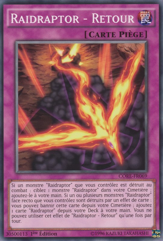 Si un monstre "Raidraptor" que vous contrôlez est détruit au combat : ciblez 1 monstre "Raidraptor" dans votre Cimetière ; ajoutez-le à votre main. Si un ou plusieurs monstres "Raidraptor" face recto que vous contrôlez sont détruits par un effet de carte : vous pouvez bannir cette carte depuis votre Cimetière ; ajoutez 1 carte "Raidraptor" depuis votre Deck à votre main. Vous ne pouvez utiliser cet effet de "Raidraptor - Retour" qu'une fois par tour.