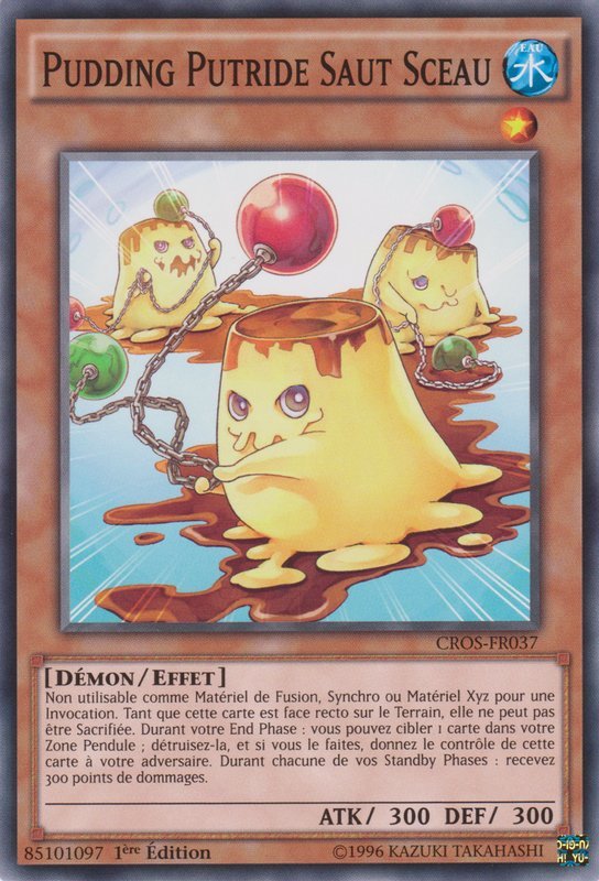 Non utilisable comme Matériel de Fusion, Synchro ou Matériel Xyz pour une Invocation. Tant que cette carte est face recto sur le Terrain, elle ne peut pas être Sacrifiée. Durant votre End Phase : vous pouvez cibler 1 carte dans votre Zone Pendule ; détruisez-la, et si vous le faites, donnez le contrôle de cette carte à votre adversaire. Durant chacune de vos Standby Phases : recevez 300 points de dommages.