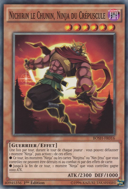 Une fois par tour, durant le tour de chaque joueur : vous pouvez défausser 1 monstre "Ninja", puis activez 1 de ces effets ; • Ce tour, les monstres "Ninja" ou les cartes "Ninjitsu" ou "Nin-Jitsu" que vous contrôlez ne peuvent être détruits ni au combat ni par des effets de carte. • Jusqu'à la fin de ce tour, 1 monstre "Ninja" que vous contrôlez gagne 1000 ATK.