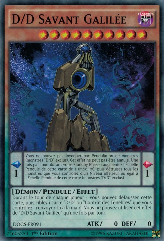Pendule : 1 Vous ne pouvez pas invoquer par Pendulation de monstres (monstres "D/D" exclus). Cet effet ne peut pas être annulé. Une fois par tour, durant votre Standby Phase : augmentez l'Échelle Pendule de cette carte de 2 (max. 10). puis détruisez tous les monstres que vous contrôlez d’un Niveau inférieur ou égal à l'Échelle Pendule de cette carte (monstres "D/D" exclus).
