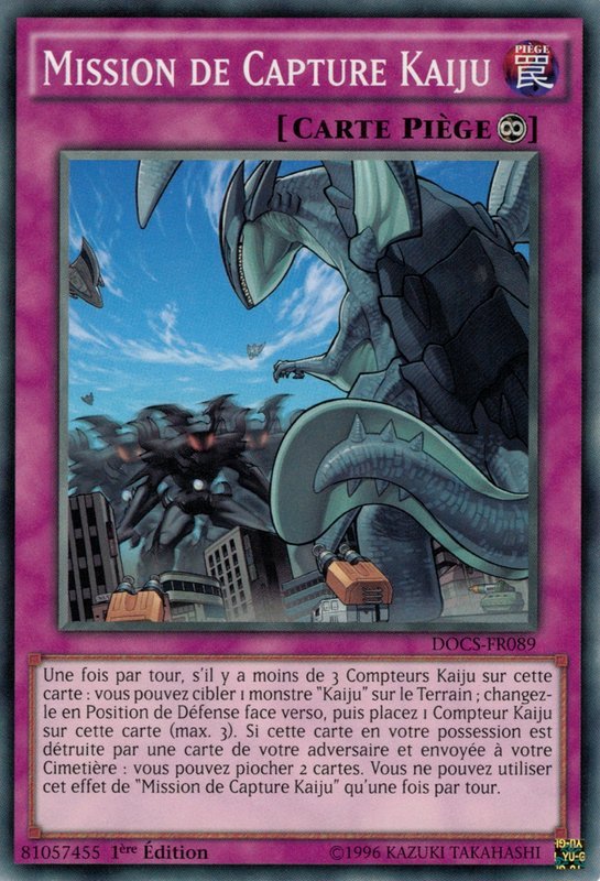 Une fois par tour, s'il y a moins de 3 Compteurs Kaiju sur cette carte : vous pouvez cibler 1 monstre "Kaiju" sur le Terrain ; changez-le en Position de Défense face verso, puis placez 1 Compteur Kaiju sur cette carte (max. 3). Si cette carte en votre possession est détruite par une carte de votre adversaire et envoyée à votre Cimetière : vous pouvez piocher 2 cartes. Vous ne pouvez utiliser cet effet de "Mission de Capture Kaiju" qu'une fois par tour.