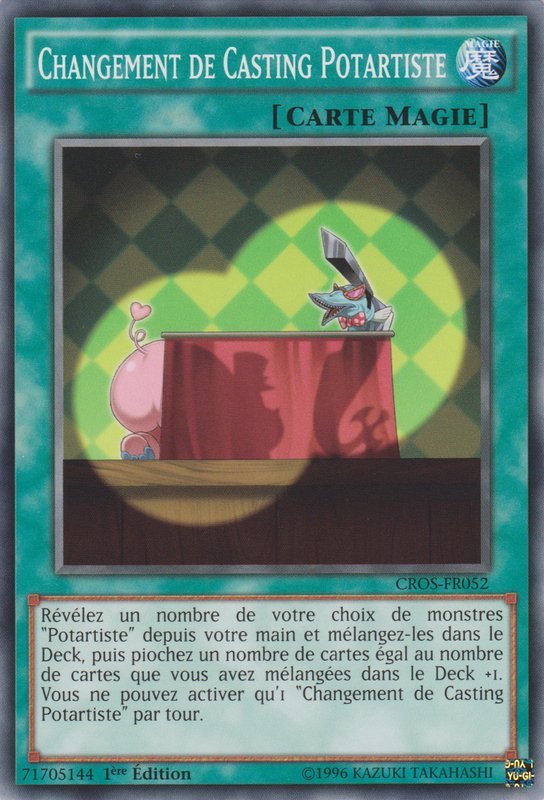 Révélez un nombre de votre choix de monstres "Potartiste" depuis votre main et mélangez-les dans le Deck, puis piochez un nombre de cartes égal au nombre de cartes que vous avez mélangées dans le Deck +1. Vous ne pouvez activer qu'1 "Changement de Casting Potartiste" par tour.