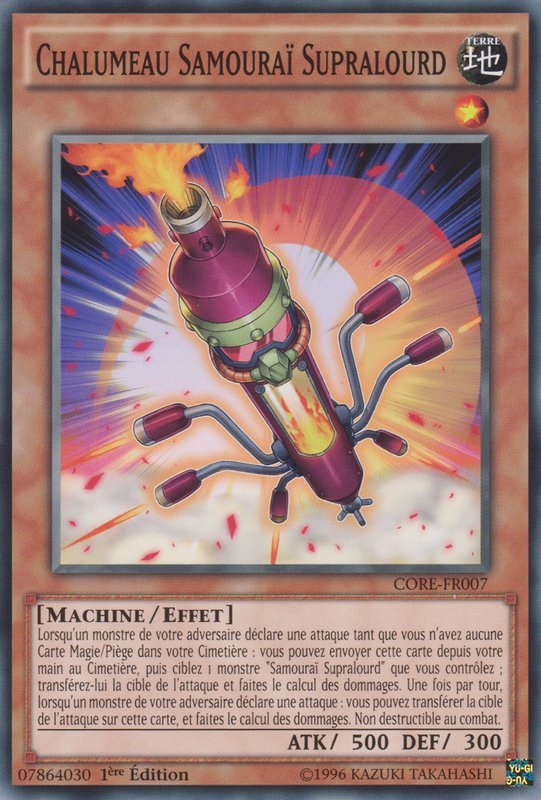 Lorsqu'un monstre de votre adversaire déclare une attaque tant que vous n'avez aucune Carte Magie/Piège dans votre Cimetière : vous pouvez envoyer cette carte depuis votre main au Cimetière, puis ciblez 1 monstre "Samouraï Supralourd" que vous contrôlez ; transférez-lui la cible de l'attaque et faites le calcul des dommages. Une fois par tour, lorsqu'un monstre de votre adversaire déclare une attaque : vous pouvez transférer la cible de l'attaque sur cette carte, et faites le calcul des dommages. Non destructible au combat.
