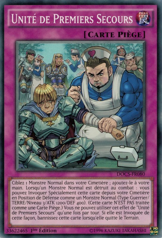 Ciblez 1 Monstre Normal dans votre Cimetière ; ajoutez-le à votre main. Lorsqu'un Monstre Normal est détruit au combat : vous pouvez Invoquer Spécialement cette carte depuis votre Cimetière en Position de Défense comme un Monstre Normal (Type Guerrier/ TERRE/Niveau 3/ATK 1200/DEF 400). (Cette carte N'EST PAS traitée comme une Carte Piège.) Vous ne pouvez utiliser cet effet de "Unité de Premiers Secours" qu'une fois par tour. Si elle est Invoquée de cette façon, bannissez cette carte lorsqu’elle quitte le Terrain.