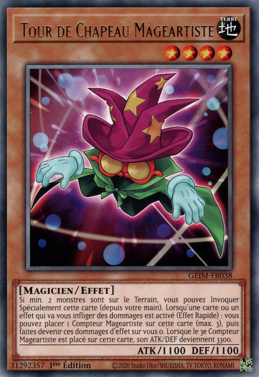 Si min. 2 monstres sont sur le Terrain, vous pouvez Invoquer Spécialement cette carte (depuis votre main). Durant le tour de chaque joueur, lorsqu'une carte ou effet qui va vous infliger des dommages est activé : vous pouvez placer 1 Compteur Mageartiste sur cette carte (max. 3), puis faites devenir ces dommages d'effet sur vous 0. Lorsque le 3e Compteur Mageartiste est placée sur cette carte, son ATK/DEF deviennent 3300.