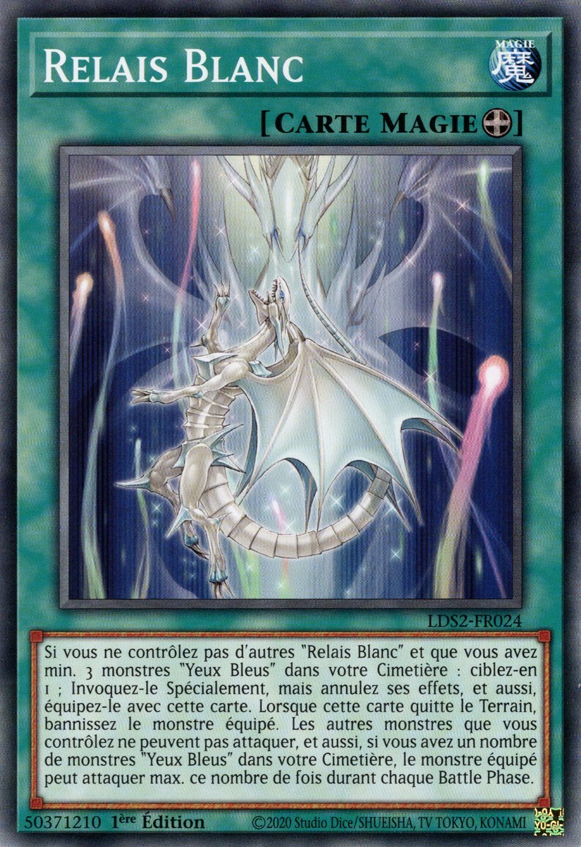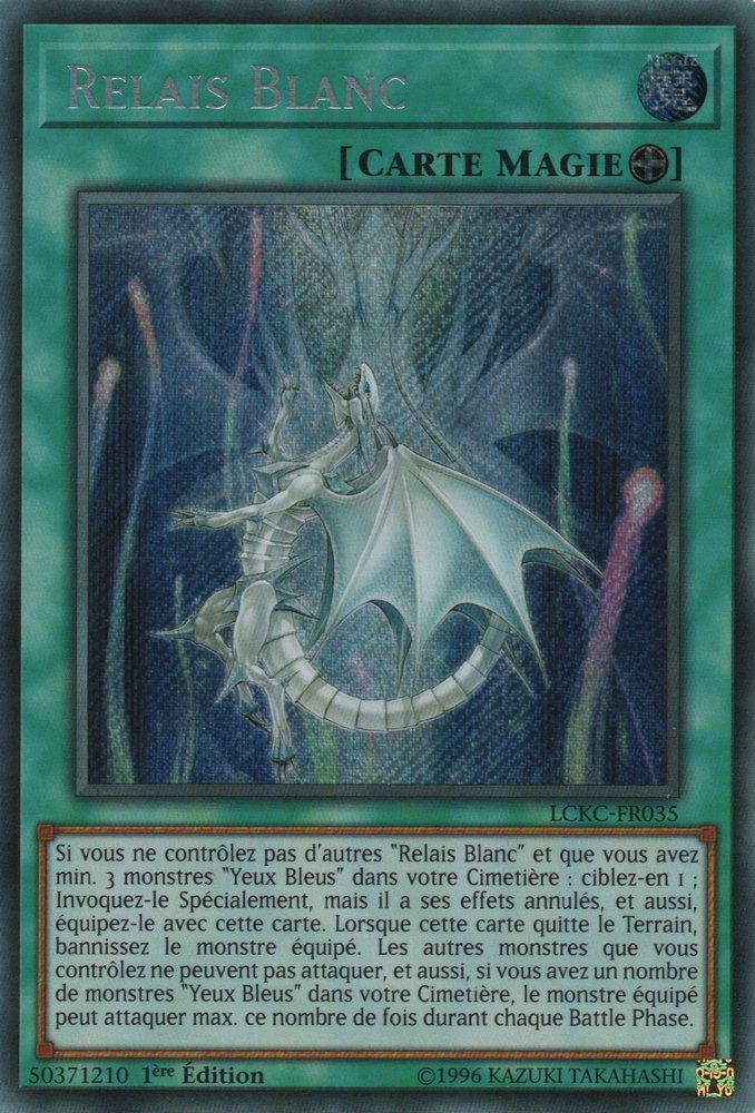 Si vous ne contrôlez pas d'autres "Relais Blanc" et que vous avez min. 3 monstres "Yeux Bleus" dans votre Cimetière : ciblez-en 1 ; Invoquez-le Spécialement, mais ses effets sont annulés, et aussi, équipez-le avec cette carte. Lorsque cette carte quitte le Terrain, bannissez le monstre équipé. Les autres monstres que vous contrôlez ne peuvent pas attaquer, et aussi, si vous avez un nombre de monstres "Yeux Bleus" dans votre Cimetière, le monstre équipé peut attaquer max. ce nombre de fois durant chaque Battle Phase.