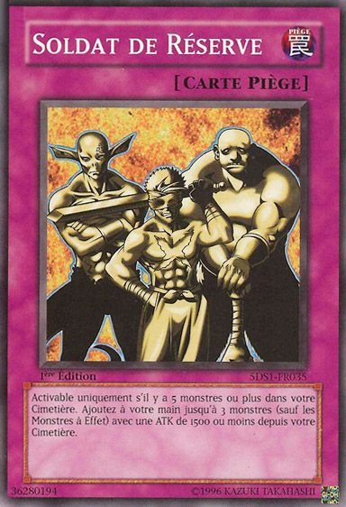 Vous pouvez activer cette carte lorsqu'il y a 5 cartes Monstre ou plus dans votre Cimetière. Prenez jusqu'à 3 Cartes Monstre (excepté les Monstres avec Effet) avec une ATK de 1500 points ou moins de votre Cimetière et ajoutez-les dans votre main.
