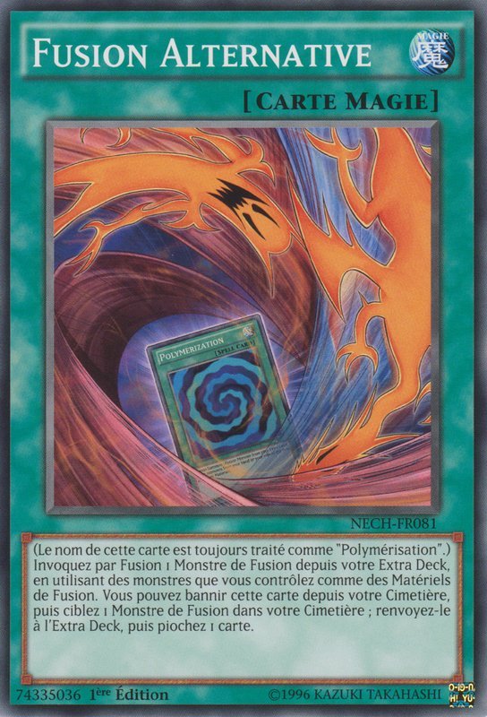 (Le nom de cette carte est toujours traité comme "Polymérisation".) Invoquez par Fusion 1 Monstre de Fusion depuis votre Extra Deck, en utilisant des monstres que vous contrôlez comme des Matériels de Fusion. Vous pouvez bannir cette carte depuis votre Cimetière, puis ciblez 1 Monstre de Fusion dans votre Cimetière ; renvoyez-le à l'Extra Deck, puis piochez 1 carte.