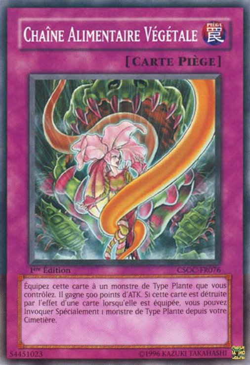 Equipez cette carte à un monstre de Type Plante que vous contrôlez. Il gagne 500 points d'ATK. Si cette carte est détruite par l'effet d'une carte lorsqu'elle est équipée, vous pouvez Invoquer Spécialement 1 monstre de Type Plante depuis votre Cimetière.