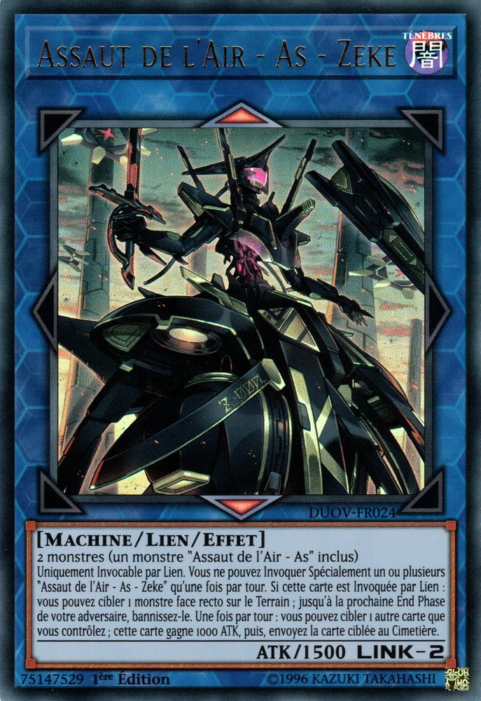 2 monstres (un monstre "Assaut de l'Air - As" inclus) Uniquement Invocable par Lien. Vous ne pouvez Invoquer Spécialement un ou plusieurs "Assaut de l'Air - As - Zeke" qu'une fois par tour. Si cette carte est Invoquée par Lien : vous pouvez cibler 1 monstre face recto sur le Terrain ; jusqu'à la prochaine End Phase de votre adversaire, bannissez-le. Une fois par tour : vous pouvez cibler 1 autre carte que vous contrôlez ; cette carte gagne 1000 ATK, puis, envoyez la carte ciblée au Cimetière.