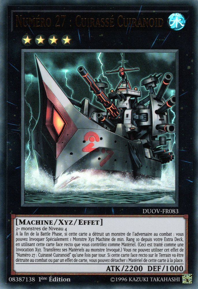 2+ monstres de Niveau 4 À la fin de la Battle Phase, si cette carte a détruit un monstre de l'adversaire au combat : vous pouvez Invoquer Spécialement 1 Monstre Xyz Machine de min. Rang 10 depuis votre Extra Deck, en utilisant cette carte face recto que vous contrôlez comme Matériel. (Ceci est traité comme une Invocation Xyz. Transférez ses Matériels au monstre Invoqué.) Vous ne pouvez utiliser cet effet de "Numéro 27 : Cuirassé Cuiranoid" qu'une fois par tour. Si cette carte face recto sur le Terrain va être détruite au combat ou par un effet de carte, vous pouvez détacher 1 Matériel de cette carte à la place.