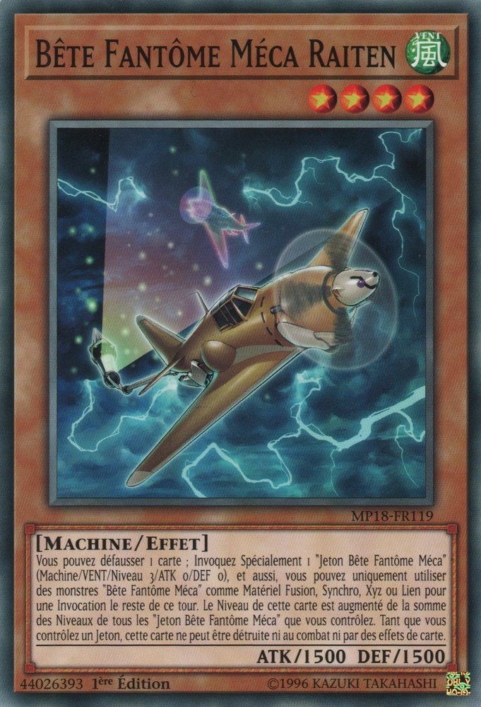 Vous pouvez défausser 1 carte ; Invoquez Spécialement 1 "Jeton Bête Fantôme Méca" (Machine/VENT/Niveau 3/ATK 0/DEF 0), et aussi, vous pouvez uniquement utiliser des monstres "Bête Fantôme Méca" comme Matériel Fusion, Synchro, Xyz ou Lien pour une Invocation le reste de ce tour. Le Niveau de cette carte est augmenté de la somme des Niveaux de tous les "Jeton Bête Fantôme Méca" que vous contrôlez. Tant que vous contrôlez un Jeton, cette carte ne peut être détruite ni au combat ni par des effets de carte.