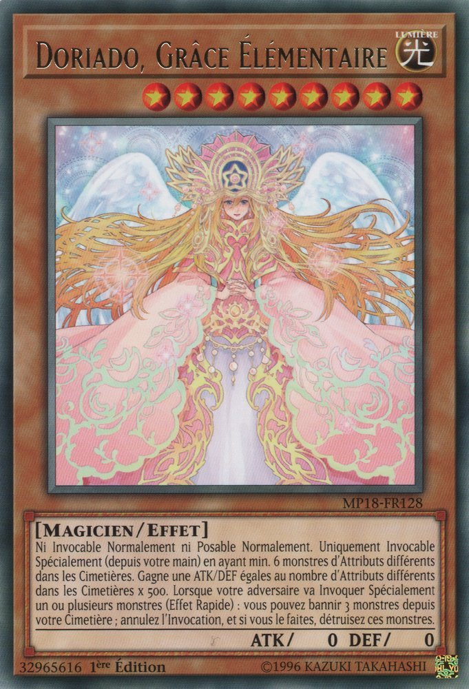 Ni Invocable Normalement ni Posable Normalement. Uniquement Invocable Spécialement (depuis votre main) en ayant min. 6 monstres d'Attributs différents dans les Cimetières. Gagne une ATK/DEF égales au nombre d'Attributs différents dans les Cimetières x 500. Lorsque votre adversaire va Invoquer Spécialement un ou plusieurs monstres (Effet Rapide) : vous pouvez bannir 3 monstres depuis votre Cimetière ; annulez l'Invocation, et si vous le faites, détruisez ces monstres.