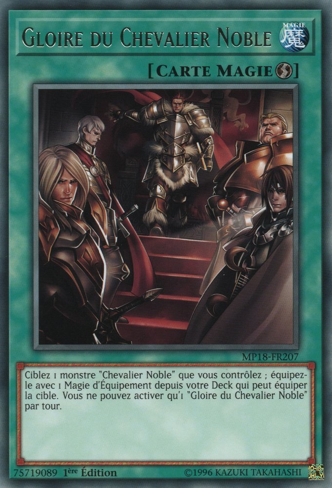 Ciblez 1 monstre "Chevalier Noble" que vous contrôlez ; équipez-le avec 1 Magie d'Équipement depuis votre Deck qui peut équiper la cible. Vous ne pouvez activer qu'1 "Gloire du Chevalier Noble" par tour.