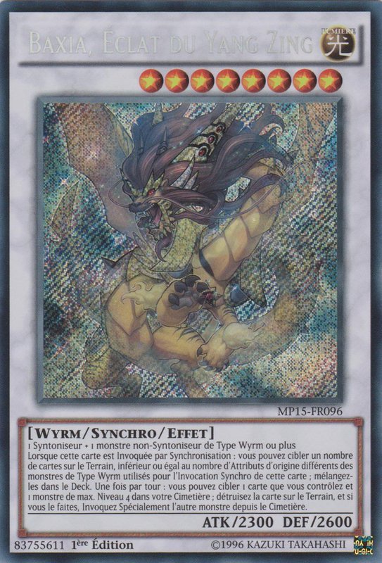 1 syntoniseur + 1 monstre non-syntoniseur de Type Wyrm ou plus Lorsque cette carte est Invoquée par Synchronisation : vous pouvez cibler un nombre de cartes sur le Terrain, inférieur ou égal au nombre d'Attributs d'origine différents des monstres de Type Wyrm utilisés pour l'Invocation Synchro de cette carte ; mélangez-les dans le Deck. Une fois par tour : vous pouvez cibler 1 carte que vous contrôlez et 1 monstre de max. Niveau 4 dans votre Cimetière ; détruisez la carte sur le Terrain, et si vous le faites, Invoquez Spécialement l'autre monstre depuis le Cimetière.