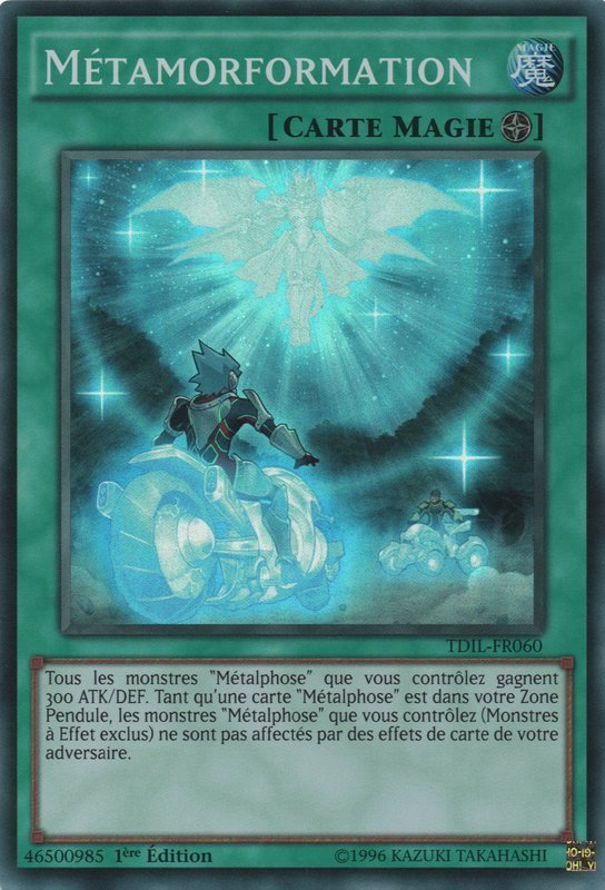 Tous les monstres "Métalphose" que vous contrôlez gagnent 300 ATK/DEF. Tant qu'une carte "Métalphose" est dans votre Zone Pendule, les monstres "Métalphose" que vous contrôlez (Monstres à Effet exclus) ne sont pas affectés par des effets de carte de votre adversaire.