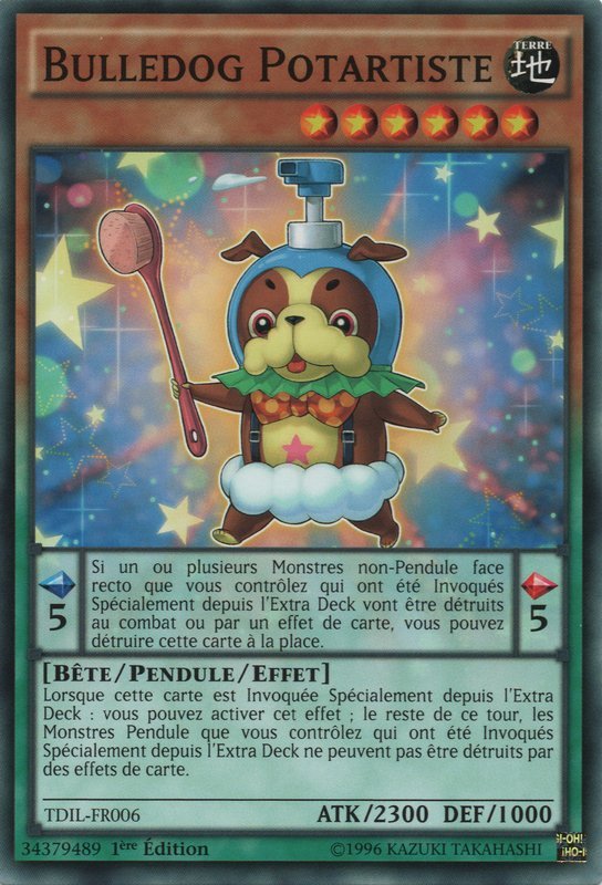 Pendule 5 : Si un ou plusieurs Monstres non-Pendule face recto que vous contrôlez qui ont été Invoqués Spécialement depuis l'Extra Deck vont être détruits au combat ou par un effet de carte, vous pouvez détruire cette carte à la place.