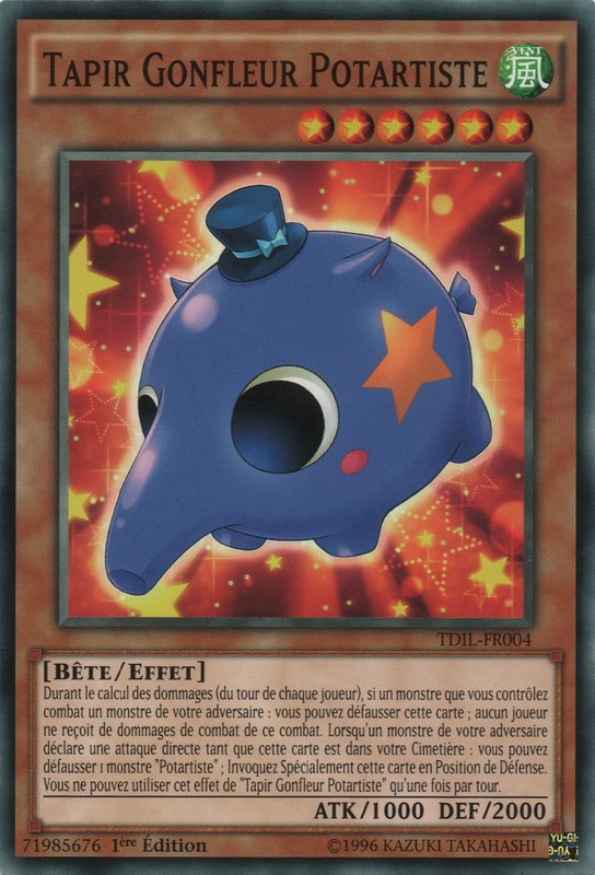 Durant le calcul des dommages (du tour de chaque joueur), si un monstre que vous contrôlez combat un monstre de votre adversaire : vous pouvez défausser cette carte ; aucun joueur ne reçoit de dommages de combat de ce combat. Lorsqu'un monstre de votre adversaire déclare une attaque directe tant que cette carte est dans votre Cimetière : vous pouvez défausser 1 monstre "Potartiste" ; Invoquez Spécialement cette carte en Position de Défense. Vous ne pouvez utiliser cet effet de "Tapir Gonfleur Potartiste" qu'une fois par tour.