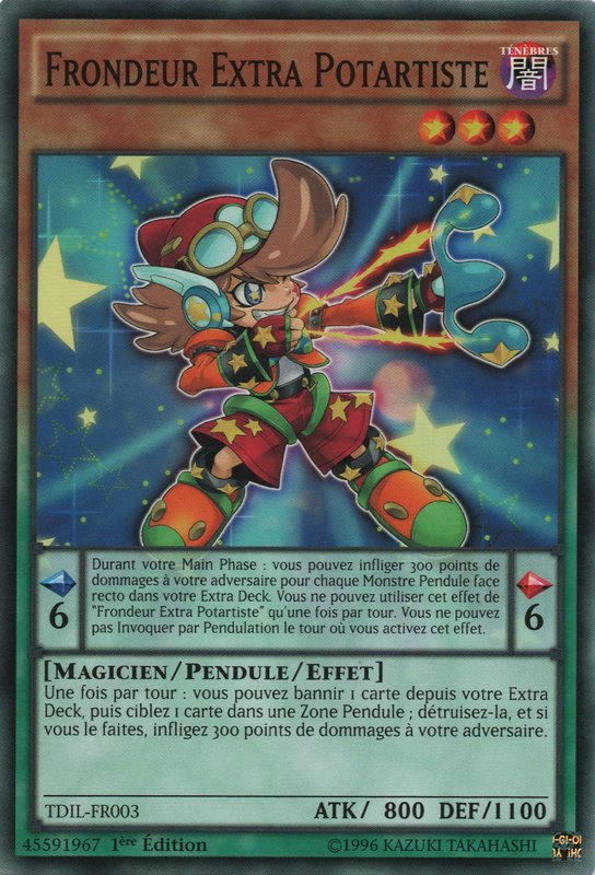 Pendule 6 : Durant votre Main Phase : vous pouvez infliger 300 points de dommages à votre adversaire pour chaque Monstre Pendule face recto dans votre Extra Deck. Vous ne pouvez utiliser cet effet de "Frondeur Extra Potartiste" qu'une fois par tour. Vous ne pouvez pas Invoquer par Pendulation le tour où vous activez cet effet.