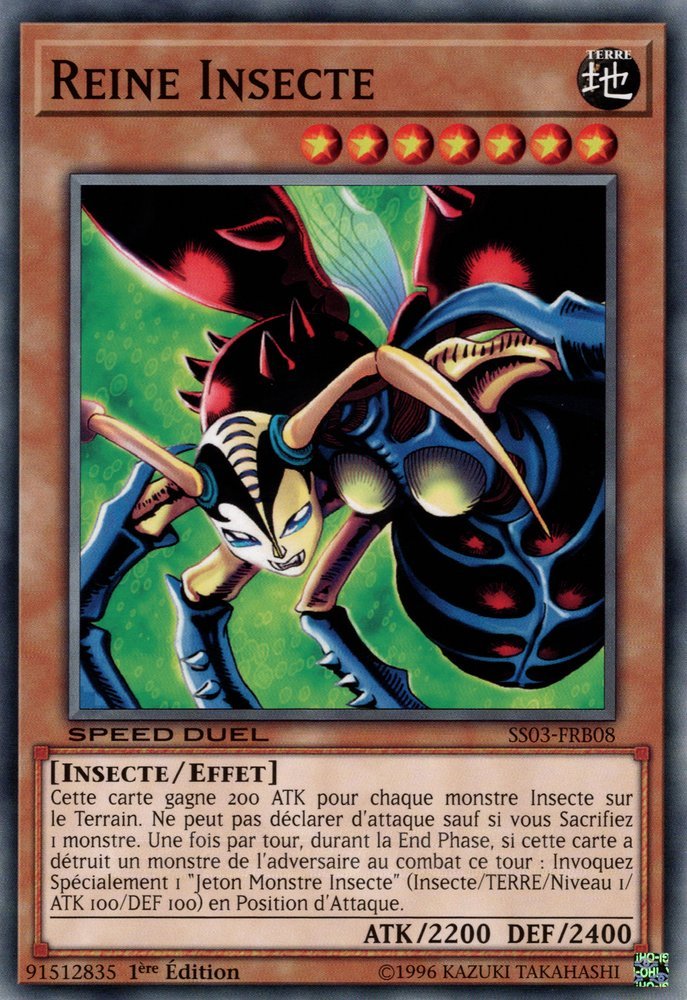 Cette carte ne peut pas déclarer d'attaque sauf si vous Sacrifiez 1 monstre. Cette carte gagne 200 ATK pour chaque monstre de Type Insecte sur le Terrain. Durant la End Phase,si cette carte a détruit, un monstre de votre adversaire au combat ce tour : Invoquez Spécialement 1 "Jeton Monstre Insecte"(Type Insecte/TERRE/Niveau 1/ATK 100/DEF 100) en Position d' Attaque.