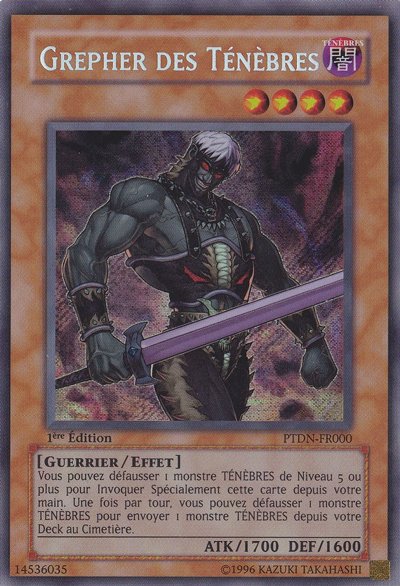 Vous pouvez défausser 1 monstre TÉNÈBRES de Niveau 5 ou plus pour Invoquer Spécialement cette carte depuis votre main. Une fois par tour, vous pouvez défausser 1 monstre TÉNÈBRES pour envoyer 1 monstre TÉNÈBRES de votre Deck au Cimetière.