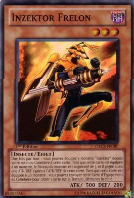 Une fois par tour : vous pouvez équiper 1 monstre "Inzektor" depuis votre main ou Cimetière à cette carte. Tant que cette carte est équipée à un monstre, le Niveau du monstre est augmenté de 3, et il gagne aussi une ATK/DEF égales à l'ATK/DEF de cette carte. Tant que cette carte est équipée à un monstre : vous pouvez envoyer cette Carte d'Équipement au Cimetière pour cibler 1 carte sur le Terrain ; détruisez la cible.