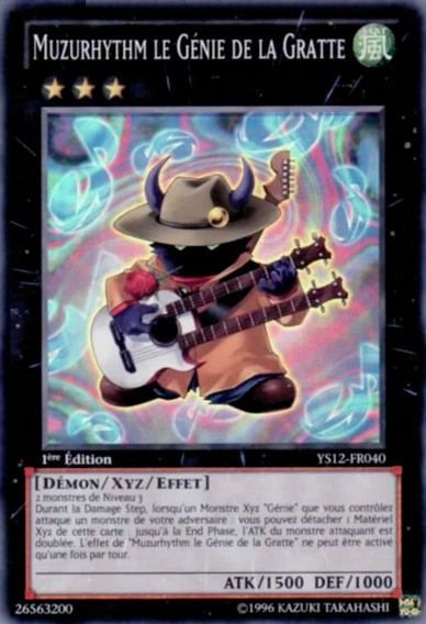 2 monstres de Niveau 3 Durant la Damage Step, lorsqu'un Monstre Xyz "Génie" que vous contrôlez attaque un monstre de votre adversaire : vous pouvez détacher un Matériel Xyz de cette carte ; jusqu'à la End Phase, l'ATK du monstre attaquant est doublé. L'effet de "Muzurhythm le Génie de la Gratte" ne peut être activé qu'une fois par tour.