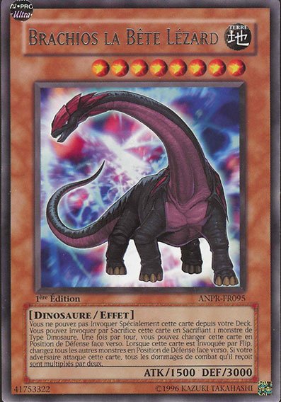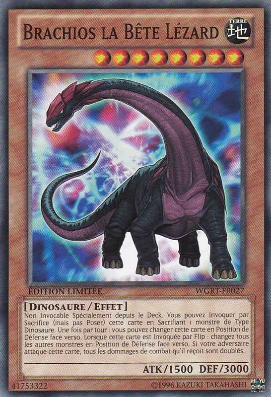 Non Invocable Spécialement depuis le Deck. Vous pouvez Invoquer par Sacrifice(mais pas Poser) cette carte en Sacrifiant 1 monstre de Type Dinosaure. Une fois par tour : vous pouvez changer cette carte en Position de Défense face verso. Lorsque cette carte est Invoquée par Flip : changez tous les autres monstres en Position de Défense face verso. Si votre adversaire attaque cette carte,tous les dommages de combat qu'il reçoit sont doublés.
