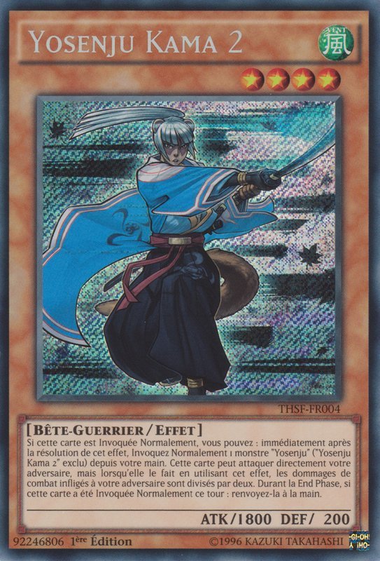Si cette carte est Invoquée Normalement, vous pouvez : immédiatement après la résolution de cet effet, Invoquez Normalement 1 monstre "Yosenju" ("Yosenju Kama 2" exclu) depuis votre main. Cette carte peut attaquer directement votre adversaire, mais lorsqu'elle le fait en utilisant cet effet, les dommages de combat infligés à votre adversaire sont divisés par deux. Durant la End Phase, si cette carte a été Invoquée Normalement ce tour : renvoyez-la à la main.