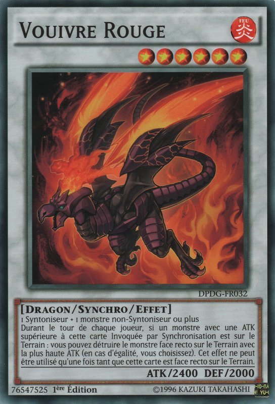 1 Syntoniseur + 1 monstre non-Syntoniseur ou plus Durant le tour de chaque joueur, si un monstre avec une ATK supérieure à cette carte Invoquée par Synchronisation est sur le Terrain : vous pouvez détruire le monstre face recto sur le Terrain avec la plus haute ATK (en cas d'égalité, vous choisissez). Cet effet ne peut être utilisé qu'une fois tant que cette carte est face recto sur le Terrain.