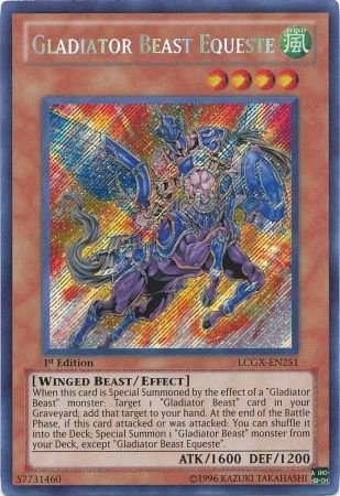Lorsque cette carte est Invoquée Spécialement par l'effet d'un monstre "Bête Gladiateur", ajoutez à votre main 1 carte "Bête Gladiateur" dans votre Cimetière. A la fin de la Battle Phase, si cette carte a attaqué ou a été attaquée, vous pouvez la renvoyer dans le Deck pour Invoquer Spécialement 1 monstre "Bête Gladiateur" depuis votre Deck, excepté "Eques, Bête Gladiateur".