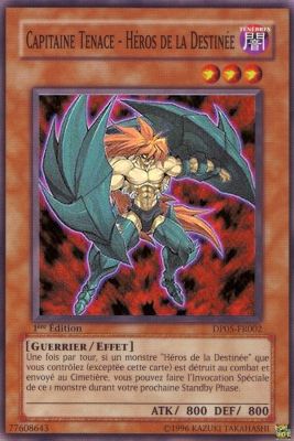 Une fois par tour, tant que cette carte est face recto sur votre Terrain, si un monstre sur votre terrain qui inclut "Héros de la Destinée" dans son nom de carte (exceptée cette carte)est détruit à l'issue d'un combat et envoyé au Cimetière, vous pouvez faire l'Invocation Spéciale de ce monstre sur votre Terrain durant votre prochaine Stanbdby Phase.