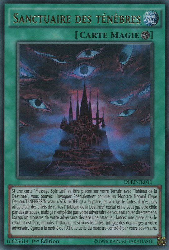 Si une carte "Message Spirituel" va être placée sur votre Terrain avec "Tableau de la Destinée", vous pouvez l'Invoquer Spécialement comme un Monstre Normal (Type Démon/TÉNÈBRES/Niveau 1/ATK 0/DEF 0) à la place, et si vous le faites, il n'est pas affecté par des effets de cartes ("Tableau de la Destinée" exclu) et ne peut pas être ciblé par des attaques, mais ça n'empêche pas votre adversaire de vous attaquer directement. Lorsqu'un monstre de votre adversaire déclare une attaque : lancez une pièce et si le résultat est face, annulez l'attaque, et si vous le faites, infligez des dommages à votre adversaire égaux à la moitié de l'ATK actuelle du monstre contrôlé par votre adversaire.