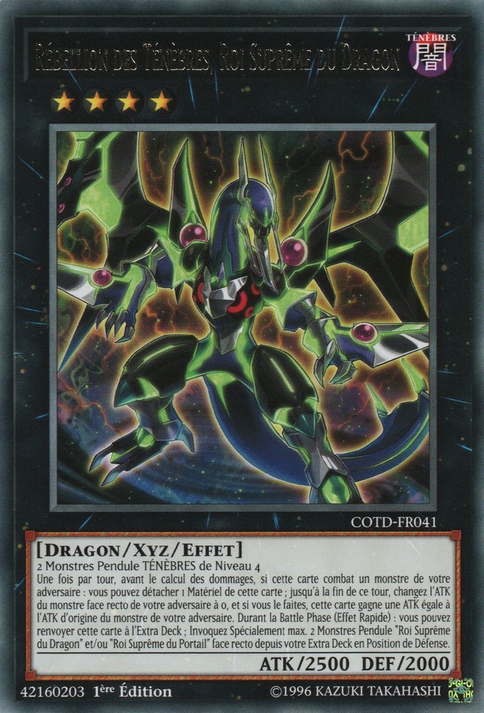 2 Monstres Pendule TÉNÈBRES de Niveau 4 Une fois par tour, avant le calcul des dommages, si cette carte combat un monstre de votre adversaire : vous pouvez détacher 1 Matériel de cette carte ; jusqu'à la fin de ce tour, changez l'ATK du monstre face recto de votre adversaire à 0, et si vous le faites, cette carte gagne une ATK égale à l'ATK d'origine du monstre de votre adversaire. Durant la Battle Phase (Effet Rapide) : vous pouvez renvoyer cette carte à l'Extra Deck ; Invoquez Spécialement max. 2 Monstres Pendule "Roi Suprême du Dragon" et/ou "Roi Suprême du Portail" face recto depuis votre Extra Deck en Position de Défense.