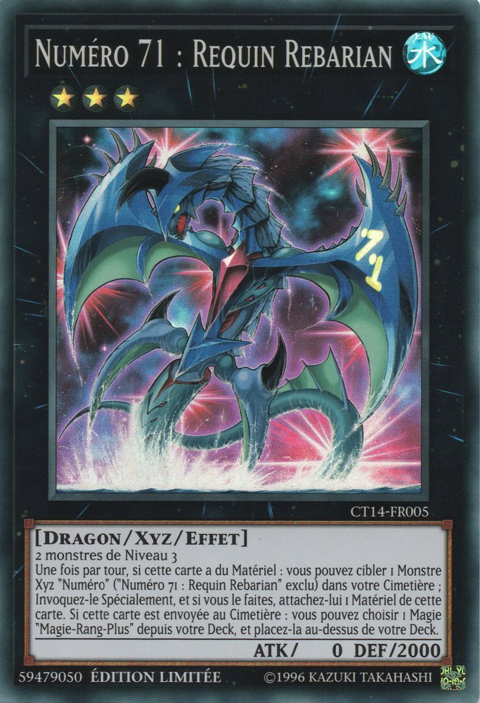 2 monstres de Niveau 3 Une fois par tour, si cette carte a du Matériel : vous pouvez cibler 1 Monstre Xyz "Numéro" ("Numéro 71 : Requin Rebarian" exclu) dans votre Cimetière ; Invoquez-le Spécialement, et si vous le faites, attachez-lui 1 Matériel de cette carte. Si cette carte est envoyée au Cimetière : vous pouvez choisir 1 Magie "Magie-Rang-Plus" depuis votre Deck, et placez-la au-dessus de votre Deck.