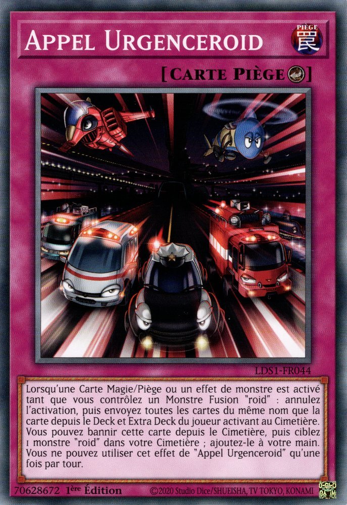 Lorsqu'une Carte Magie/Piège ou un effet de monstre est activé tant que vous contrôlez un Monstre Fusion "roid" : annulez l'activation, puis envoyez toutes les cartes du même nom que la carte depuis le Deck et Extra Deck du joueur activant au Cimetière. Vous pouvez bannir cette carte depuis le Cimetière, puis ciblez 1 monstre "roid" dans votre Cimetière ; ajoutez-le à votre main. Vous ne pouvez utiliser cet effet de "Appel Urgenceroid" qu'une fois par tour.