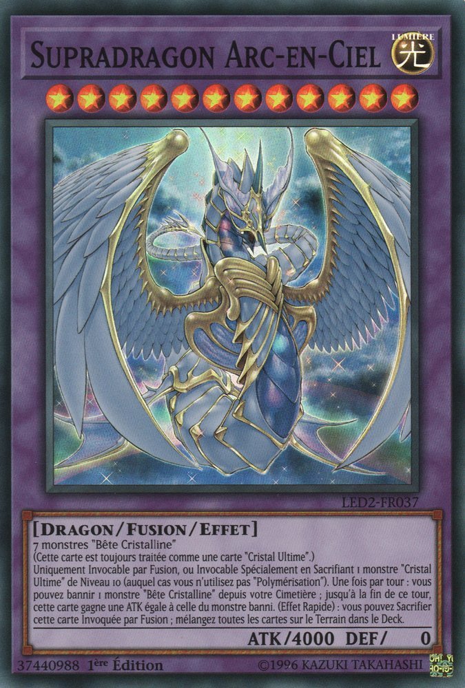 7 monstres "Bête Cristalline" (Cette carte est toujours traitée comme une carte "Cristal Ultime".) Uniquement Invocable par Fusion, ou Spécialement en Sacrifiant 1 monstre "Cristal Ultime" de Niveau 10 (auquel cas vous n'utilisez pas "Polymérisation"). Une fois par tour : vous pouvez bannir 1 monstre "Bête Cristalline" depuis votre Cimetière ; jusqu'à la fin de ce tour, cette carte gagne une ATK égale à celle du monstre banni. (Effet Rapide) : vous pouvez Sacrifier cette carte Invoquée par Fusion ; mélangez toutes les cartes sur le Terrain dans le Deck.