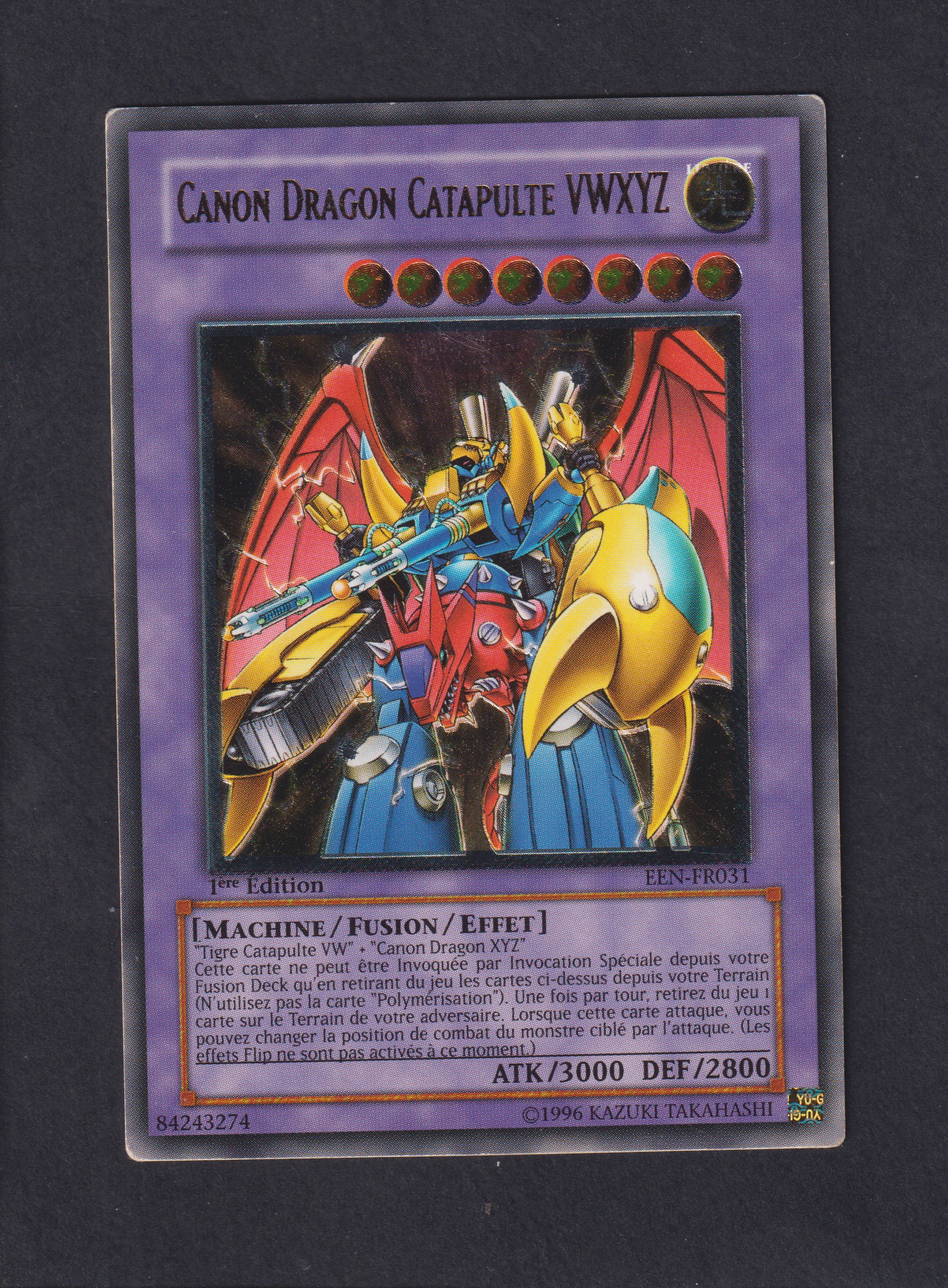 "Tigre Catapulte VW" + "Canon Dragon XYZ" Cette carte ne peut être Invoquée par Invocation Spéciale depuis votre Extra Deck qu'en retirant du jeu les cartes ci-dessus depuis votre Terrain (N'utilisez pas la carte "Polymérisation"). Une fois par tour, retirez du jeu 1 carte sur le Terrain de votre adversaire. Lorsque cette carte attaque, vous pouvez changer la position de combat du monstre ciblé par l'attaque. (Les effets Flip ne sont pas activés à ce moment.)