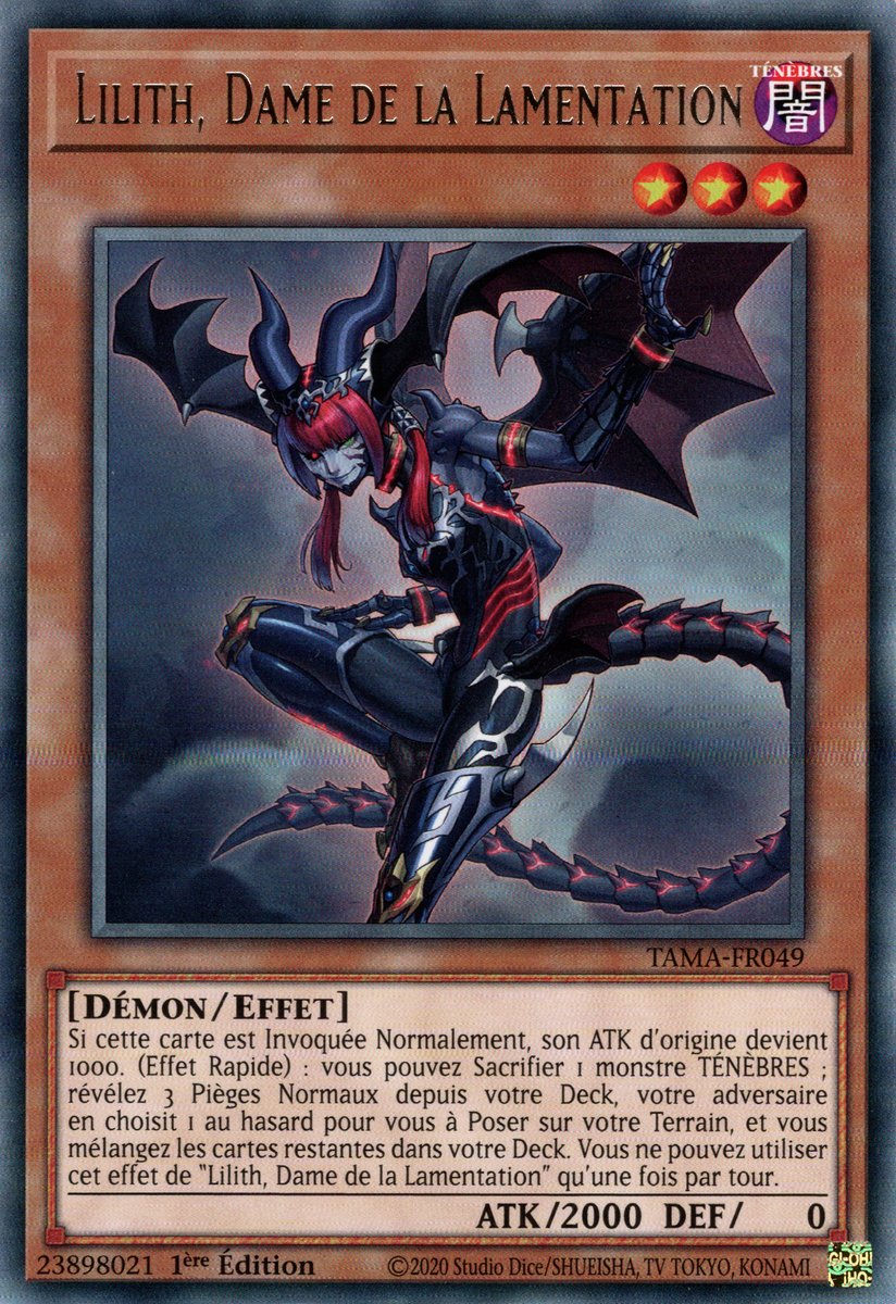 Si cette carte est Invoquée Normalement, son ATK d'origine devient 1000. (Effet Rapide) : vous pouvez Sacrifier 1 monstre TÉNÈBRES ; révélez 3 Pièges Normaux depuis votre Deck, votre adversaire en choisit 1 au hasard pour vous à Poser sur votre Terrain, et vous mélangez les cartes restantes dans votre Deck. Vous ne pouvez utiliser cet effet de "Lilith, Dame de la Lamentation" qu'une fois par tour.
